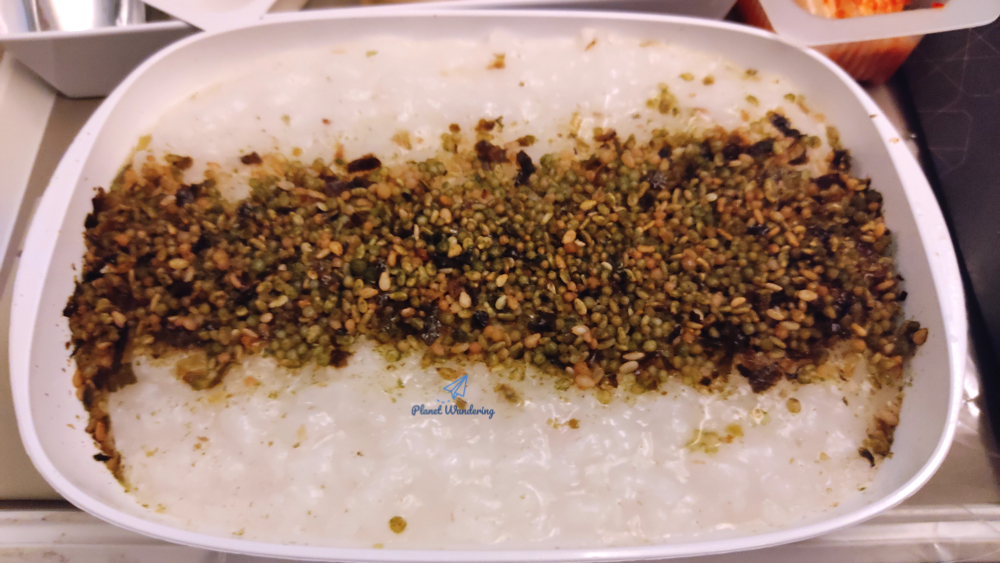 죽그릇을 덮고있던 호일을 열면 이런 모습입니다. 흰쌀 죽이 가득 담겨있고 깨가 지나치다 싶을 정도로 많이 뿌려져 있네요. 맛은 훌륭합니다. 여기에 함께 나온 김치를 곁들여 드시면 아삭아삭 맛이 좋지요. 아침식사로는 스크램블보다는 죽이 더 어울릴 것 같네요.