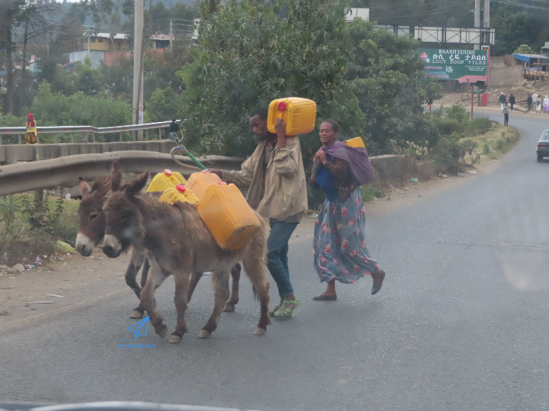 이 부부는 그나마 형편이 낫습니다. 당나귀에 물통을 얹어 갈 수 있으니까요. 당나귀 한 마리가 두 통씩, 그리고 부부가 한 통씩 짊어지고 집으로 돌아갑니다. 식당 같은 장사를 하는 사람들일 수도 있겠네요. 에티오피아 여인들이 저렇게 보자기로 아이를 업듯이 무거운 물건을 싸서 짊어지고 다니는 걸 많이 볼 수 있습니다.