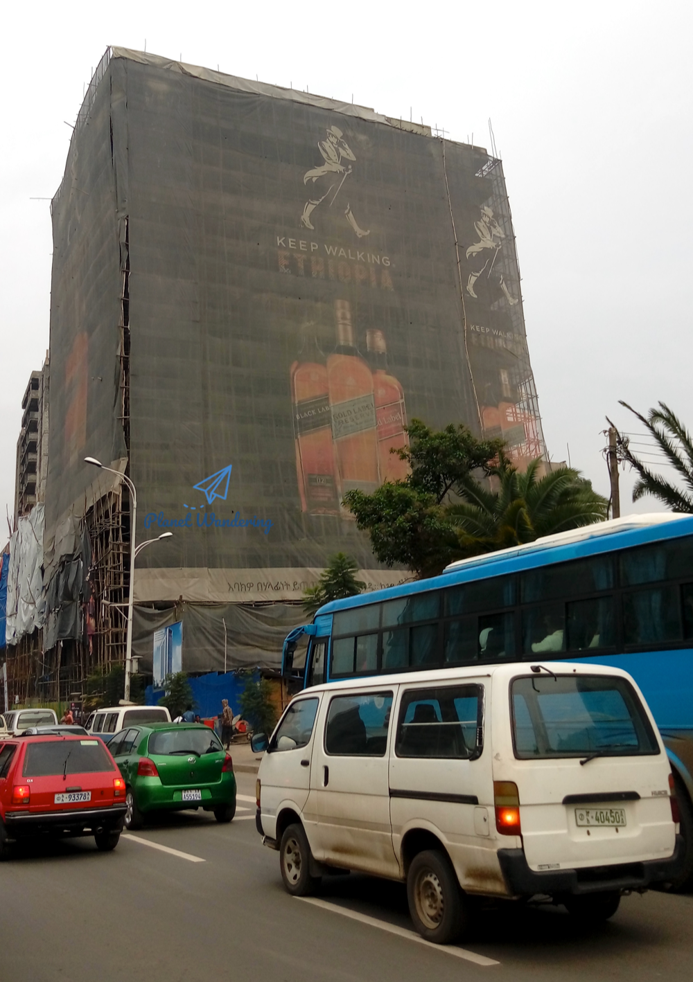 건축 중인 건물 외벽 가림막에 조니워크 위스키가 광고를 걸었습니다. Keep Walking Ethiopia 라는 문구가 조니워커 Striding man 그림과 함께 걸려있습니다. 에티오피아의 발전을 격려하는 의미로 받아들이면 꽤나 멋진 광고 카피로 보입니다.