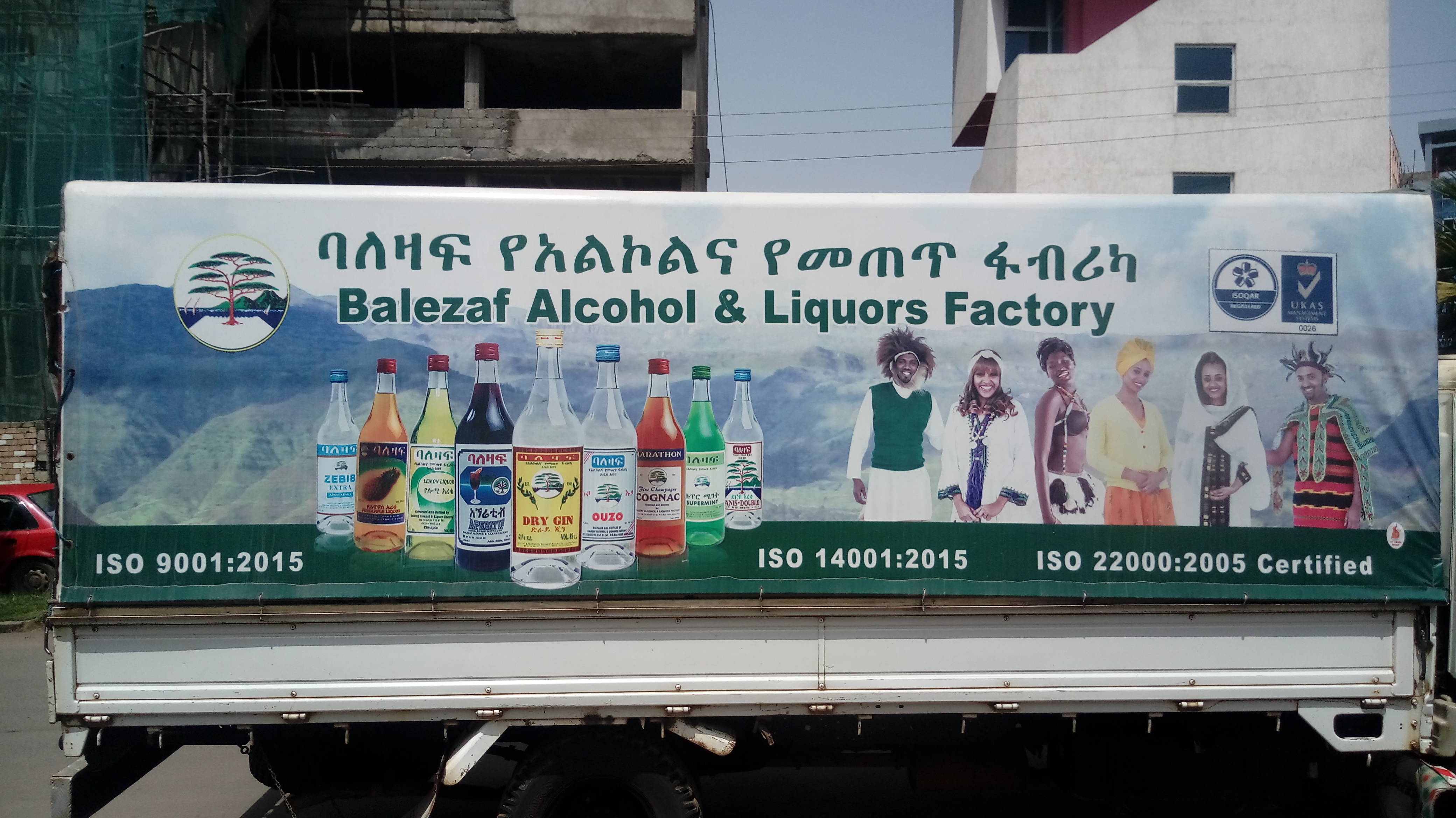 길거리에서 마주친 에티오피아 주류회사 차량의 광고. 술 제품들과 함께 민족 별 민속의상을 입은 모델들이 나와있다. 에티오피아는 80여개 민족이 토요일에 민족 간 갈등이 끊임없이 나타난다.