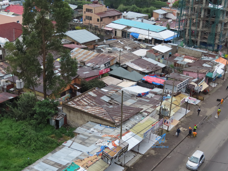 호텔 복도에서 내려다 본 건너편 주택가의 모습입니다. 양철 슬레이트로 엮은 지붕과 담벼락은 에티오피아의 흔한 풍경입니다. 햇볕이 내리쬐면 집 안이 아주 더워지고, 폭우가 내릴 때는 지붕 때리는 빗소리가 아주 크게 들린다고 하죠.