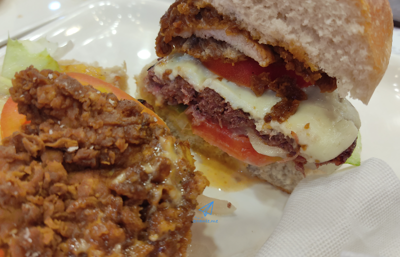 조금 비싼 버거를 주문했습니다. 맥도날드로 치면 빅맥 세트 정도에 해당하는데 우리 돈으로 1만원을 훌쩍 넘는 비싼 음식이었습니다. 빅맥처럼 빵이 3겹이고 패티도 2개가 들어있습니다. 가게에서 직접 만든 수제 빵으로 보이는데 아무래도 건조한 식감이 있고 빵 모양새도 조금 어색하기는 합니다.