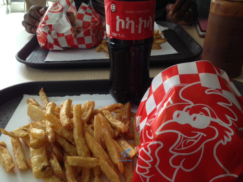 에티오피아에서 햄버거는 약간 비싼 음식 같습니다. 인제라 같은 에티오피아의 보통 음식보다 가격이 훨씬 비싸죠. 우리나라에서 먹는 보통 가격대의 햄버거 세트와 가격이 비슷합니다. 감자튀김은 버거킹 감자 정도로 크고, 튀기는 기술은 그리 좋지 않은지 바싹 튀겨진 느낌으로 부드러운 맛은 덜합니다.