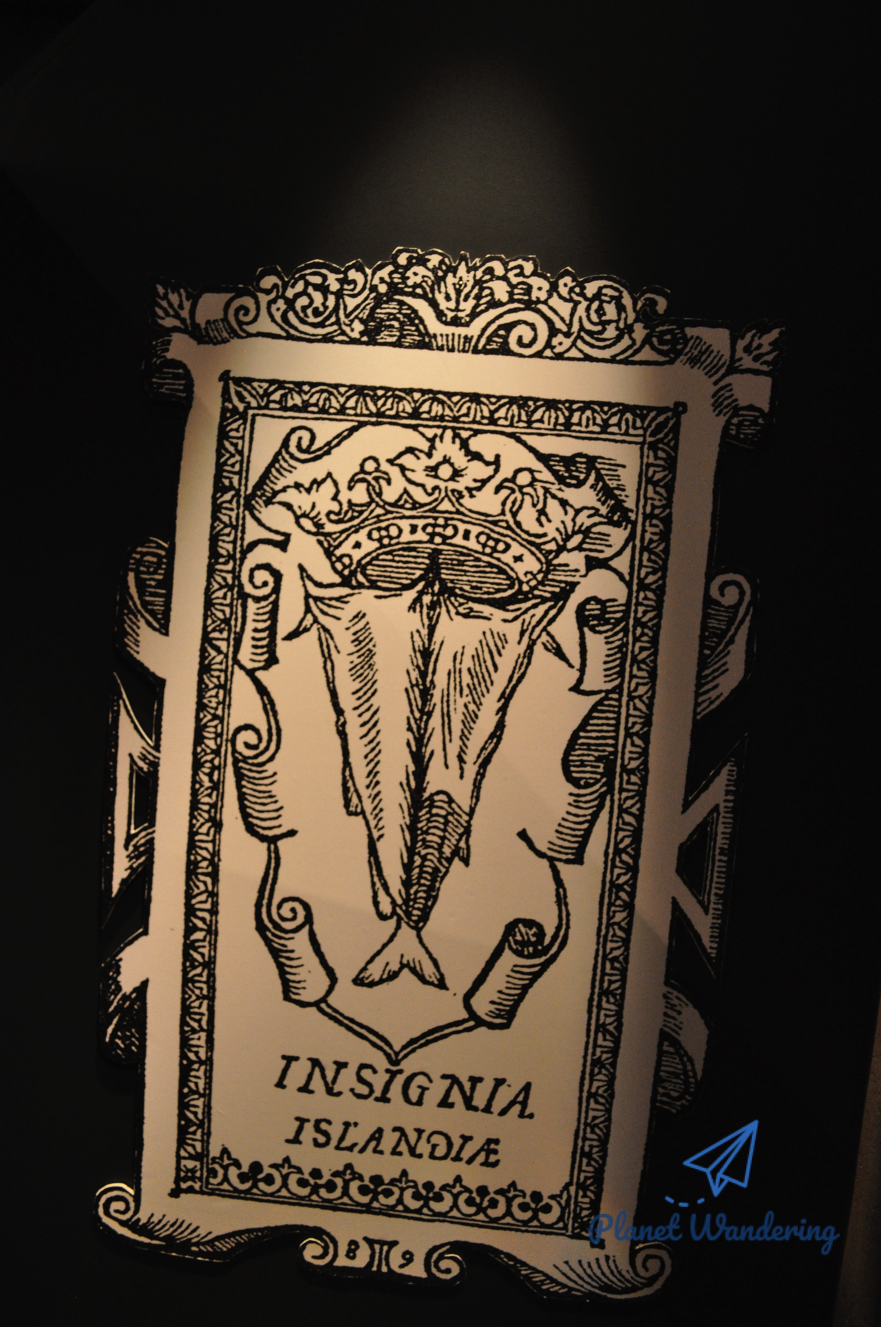 손질한 대구를 들고 서 있는 아이들의 사진으로 예전에 잡던 대구가 얼마나 큰 크기였는지 짐작할 수 있습니다. 오른쪽의 대구 문양은 손질한 대구 필레가 왕관을 쓰고 있는 형상입니다. 이 문양은 1500년대부터 본격적으로 사용되어 동전과 지도에도 널리 사용되었고 INSIGNIA ISLANDIAE 는 ISLAND OF ICELAND 라는 의미를 담고 있습니다.