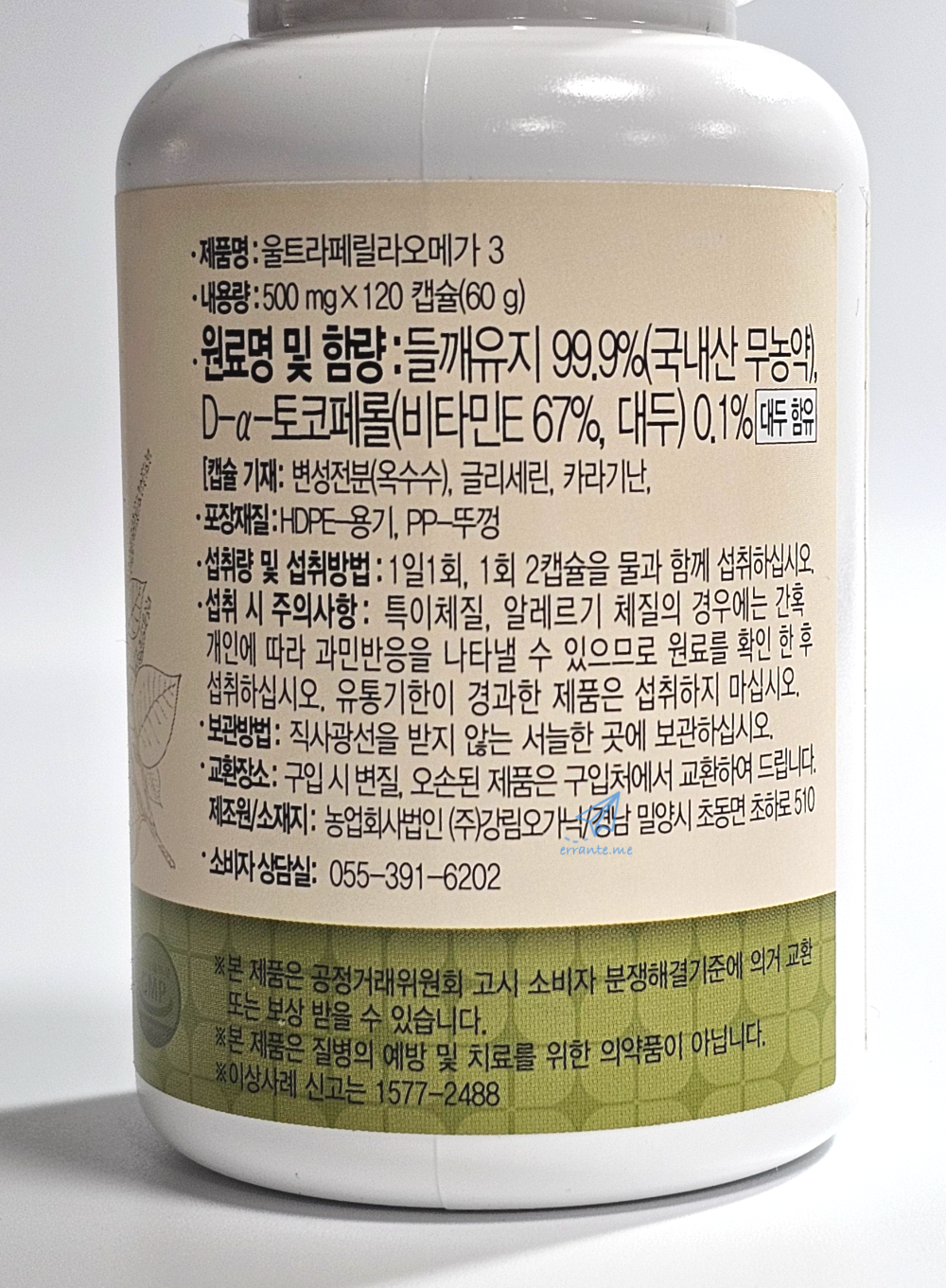 보통 오메가3 오일이라고 하면 물개나 바다사자 같은 동물성 오일을 생각하게 되죠. 먹고 나면 꽁치찌개나 고등어구이를 먹고 난 다음의 비릿한 느낌이 올라오곤 합니다. 그리고 그걸 '오메가3 잘 먹었다, 불포화지방산을 듬뿍 먹었네~'라고 생각하게 됩니다. 우연한 기회에 강림오가닉을 경영하시는 분이 참석한 문화 행사에서 선물로 받아온 [울트라 페릴라 오메가3]를 먹어봤습니다. 작은 규모의 행사라 참석한 모든 분들이 선물로 받아가셨죠. 오메가3는 오래전부터 알고 있던 터라 별생각 없이 먹어봤는데, 몇 번을 먹어도 비릿한 느낌이 올라오지 않았습니다. 게다가 강림오가닉은 무농약 공법으로 농사를 짓는 농업법인이라 이상하다 싶어 용기의 설명을 읽어봤습니다. 그런데,,