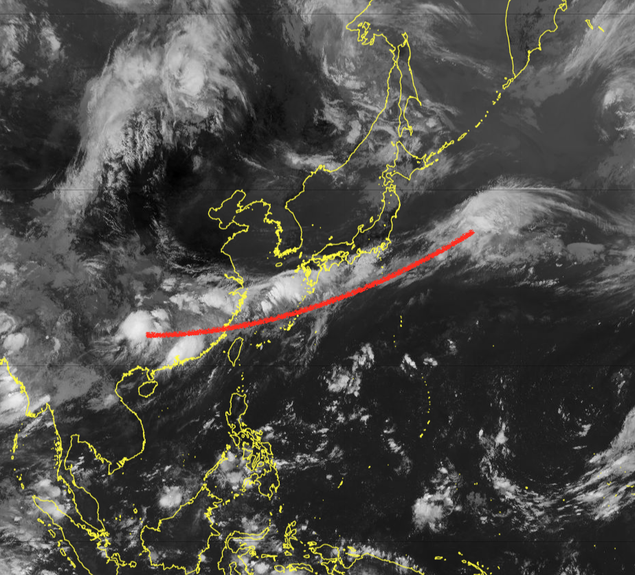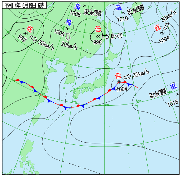 6월 19일 일본기상청의 일기도를 보면 일본 남쪽 바다를 따라 파티 장식과 비슷한 장마전선이 형성되어 있는 것을 확인할 수 있습니다. 이 장마전선을 위성사진으로 보면 긴 구름띠가 만들어져 있는 걸 볼 수 있죠. 이 장마전선이 주변 기상환경의 영향을 받아 우리나라 북쪽까지 올라오기도 하고, 지금처럼 남쪽으로 처져있기도 합니다. 가끔은 장마전선 중간이 끊어지기도 하는데, 그렇다고 장마가 끝나는 것이 아니라 다시 이어지기도 합니다.