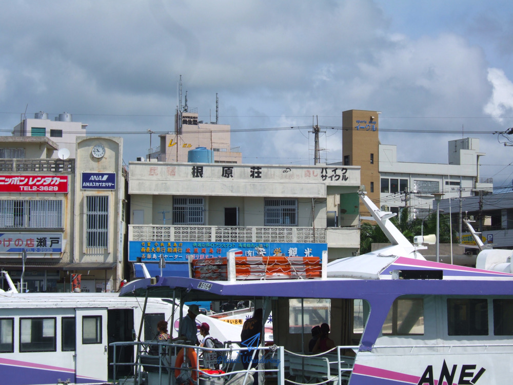 항구에 바짝 붙어 민박집 네하라가 있습니다. 오토바이와 자전거도 빌려주는 모양이네요. 2006년의 풍경이니 20년에 가까이 지난 지금도 네하라 민박집 건물이 그대로 남아있는지 궁금합니다. 이 민박집 1층에는 안에이관광 사무소가 있습니다. 지금도 야에야마 제도의 섬들을 연결하는 배를 운항하는 안에이관광은 당시에도 이시가키와 이리오모테를 연결하는 쾌속선을 운영하고 있었죠.