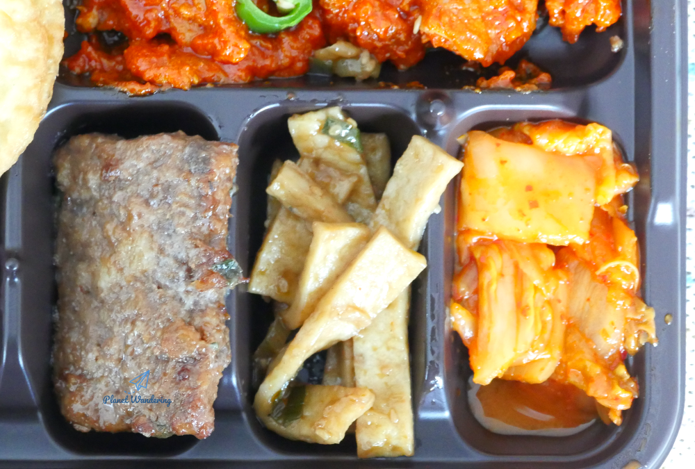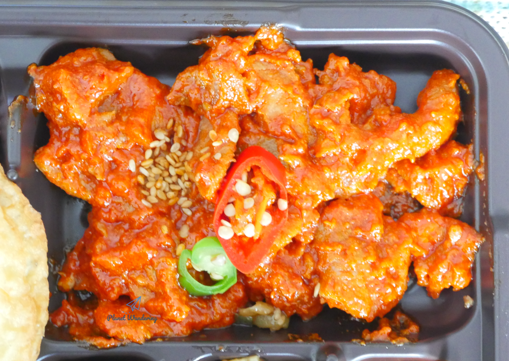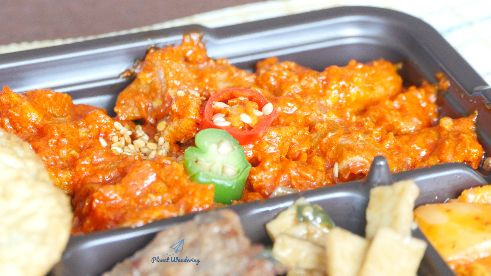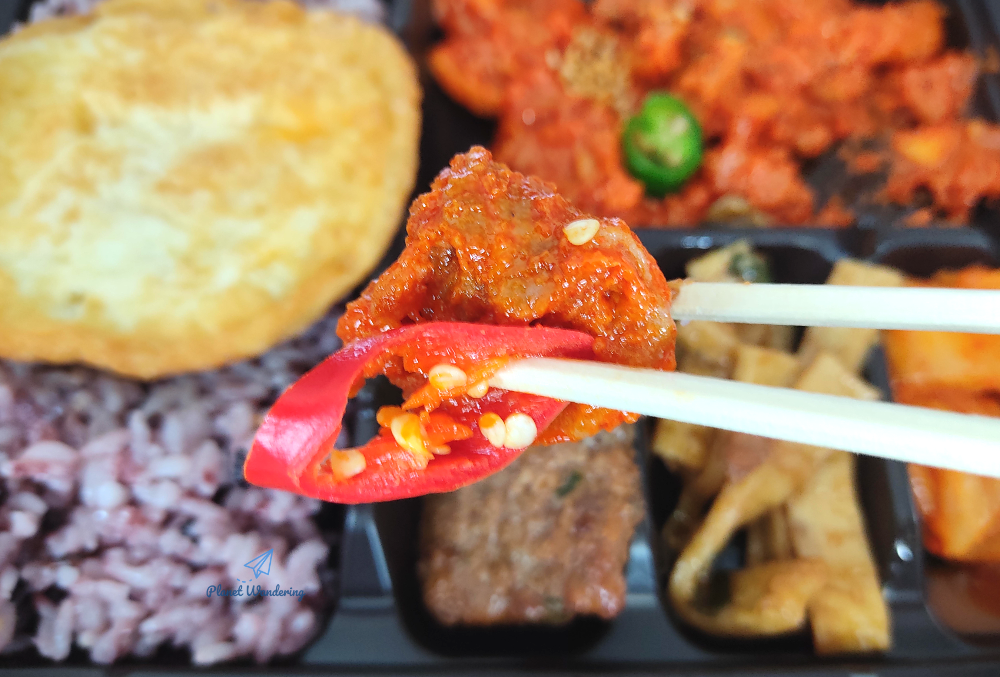 반찬 가짓수가 많은 건 아닙니다. 메인 반찬은 제육볶음인데 혼합육이 아니라 진짜 고기만 제육볶음 양념에 볶은 거죠. 정성이 느껴지는 게, 제육볶음을 용기에 담은 다음 빨간 고추 한 조각, 청고추 한 조각을 깨와 함께 예쁘게 고명으로 올려놓았네요. 제육볶음은 새빨간 양념에 비해 실제 먹어보면 부드러운 느낌으로 그리 맵지도 않습니다. 먹고 나서도 속이 편안합니다. 맛있다고 제육볶음만 집어먹으면 좀 짜게 느껴지기는 하죠.