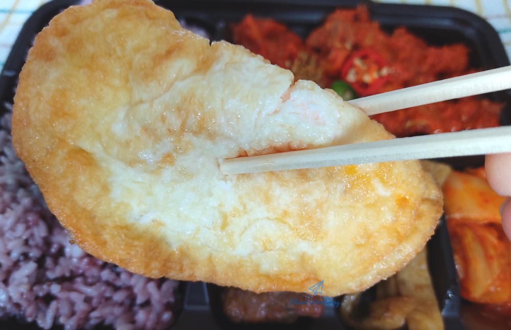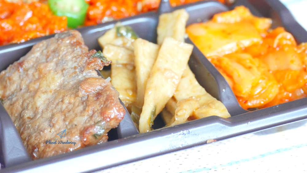 달달한 맛의 너바아니 한 조각이 들어있는데 색깔은 거무튀튀하지만 맛은 한 조각 더 먹고 싶을 정도로 아주 좋습니다. 그 옆으로 채 썬 어묵을 달달한 간장양념에 볶은 어묵볶음과 볶음김치가 들어있습니다. 편의점 도시락에는 법령 때문에 생김치를 담을 수 없어 모든 편의점 도시락에는 볶음김치가 들어가게 되죠.