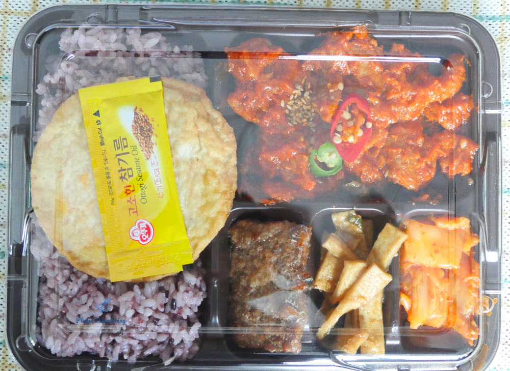 △ 구 성 : 돼지제육볶음 + 달걀 프라이 + 너비아니 + 어묵볶음 + 볶음김치 +잡곡밥 + 참기름