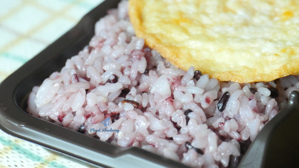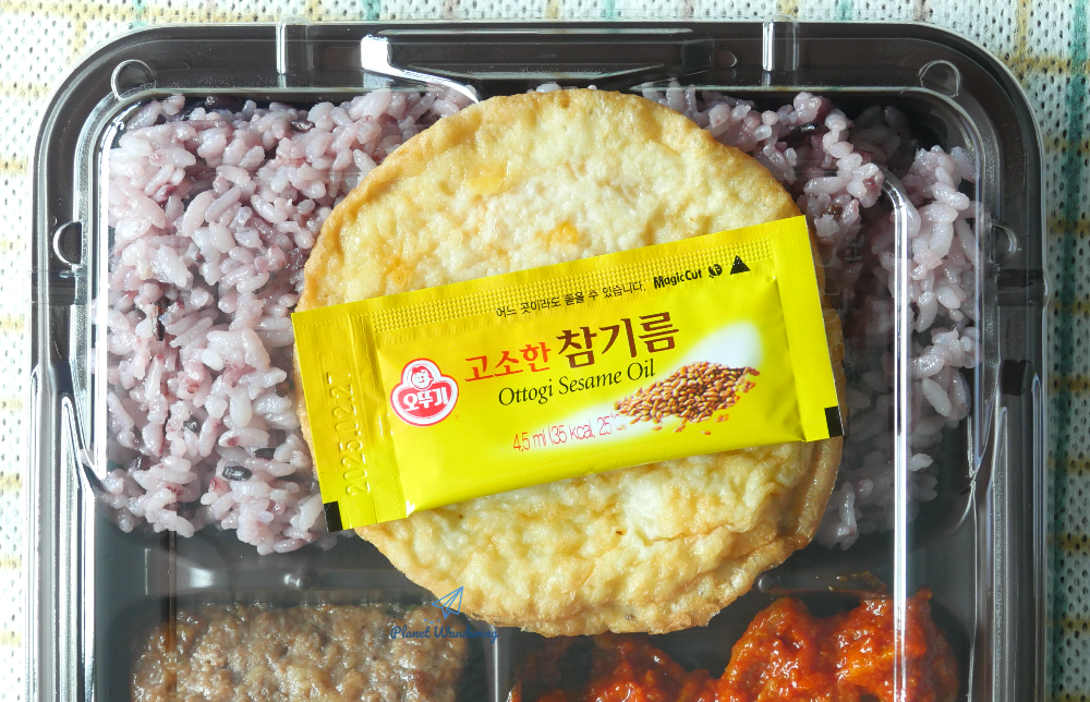 엇~! 포장 띠지를 벗기니 달걀 후라이 위로 참기름이 하나 들어있네요. 정말 혜자로운 도시락입니다. 구성을 살펴볼까요? 밥은 흑미가 들어가 거뭇거뭇한 때깔의 잡곡밥입니다. 요즘 식당에서도 잡곡밥 먹기가 쉽지 않은데 몸에 좋은 잡곡밥을 편의점 도시락으로 먹을 수 있어 좋네요. 달걀 프라이는 하나하나 달걀을 깨서 후라이 한 건 아니고, 난백액이란 이름으로 계란 흰자만 모아서 액상으로 만든 식재료로 만들었습니다. 뭐 대량 생산을 하려면 어떨 수 없겠죠.