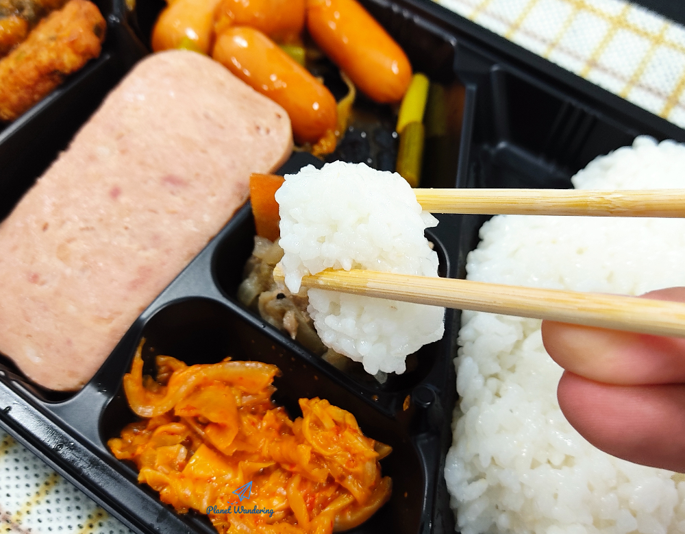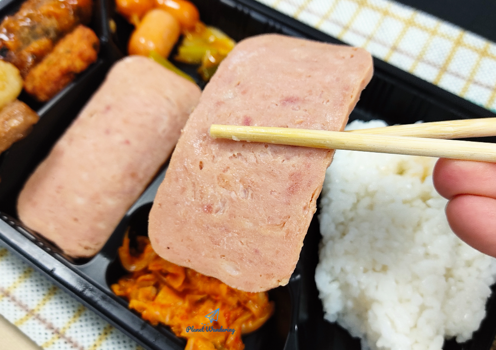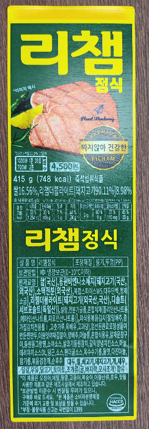 도시락의 이름을 따온 메인 반찬 리챔은 통조림에서 썰어낸 듯 한 모양새로 2조각이 들어있습니다. 전자레인지에 살짝 돌려 따뜻하게 드시면 더 맛있겠지만 전자레인지를 좋아하지 않는 방랑객은 그냥 찬 느낌 그대로 먹습니다. 더블라이트 라는 이름처럼 리챔은 짜지 않고 고소하게 맛이 좋습니다.
