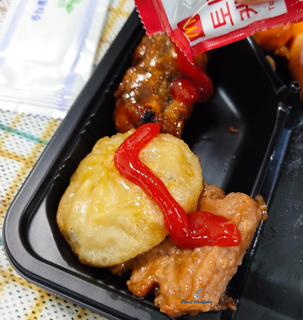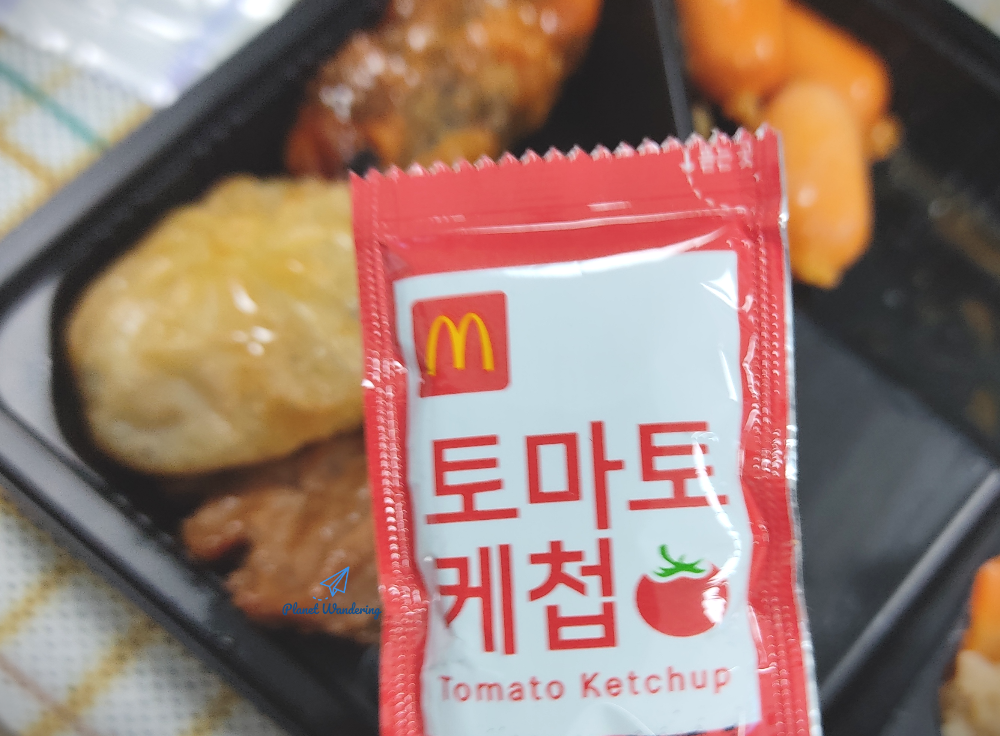 동그랑땡과 주머니 만두 튀김, 김말이 튀김과 너비아니도 있습니다. 한 조각씩만 들어있지만 4가지 반찬이 모두 다른 맛과 느낌을 주기 때문에 도시락 먹는 재미가 한층 더하겠네요. 이쯤해서 먹는 재미를 좀 더해봐야겠습니다. 이 반찬들은 토마토케첩이 잘 어울릴 것 같네요. 사무실 서랍 속에 잠들어있던 맥도날드 케첩을 찾아냈습니다.