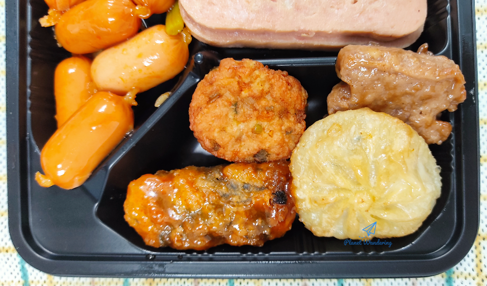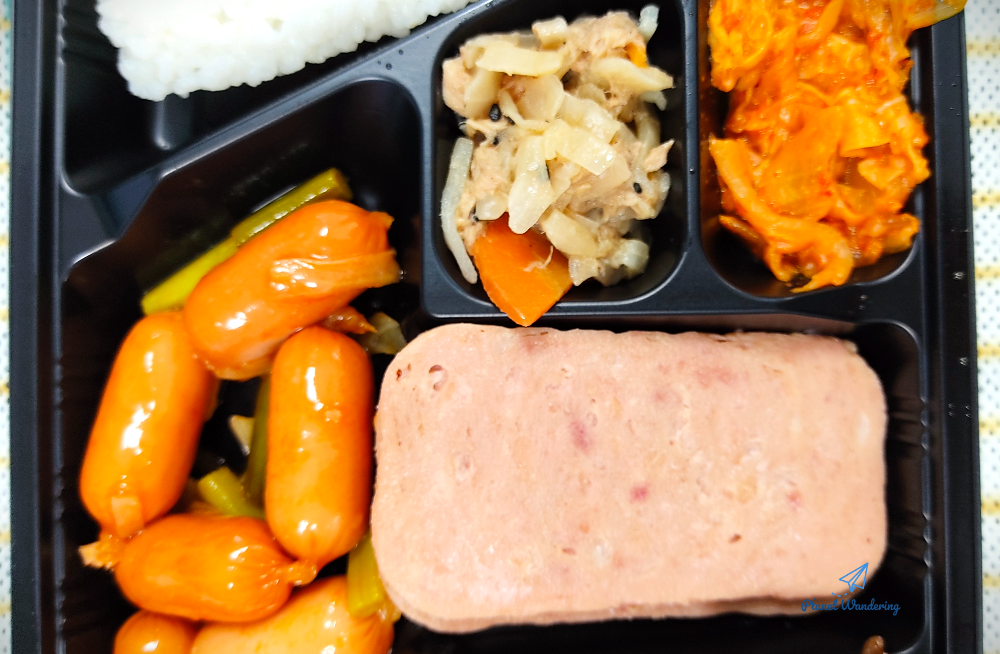 △ 구 성 : 리챔(스팸) + 쌀밥 + 마늘종 비엔나소시지 + 참치볶음 + 김치 + 너비아니 + 만두 + 동그랑땡 + 김말이튀김