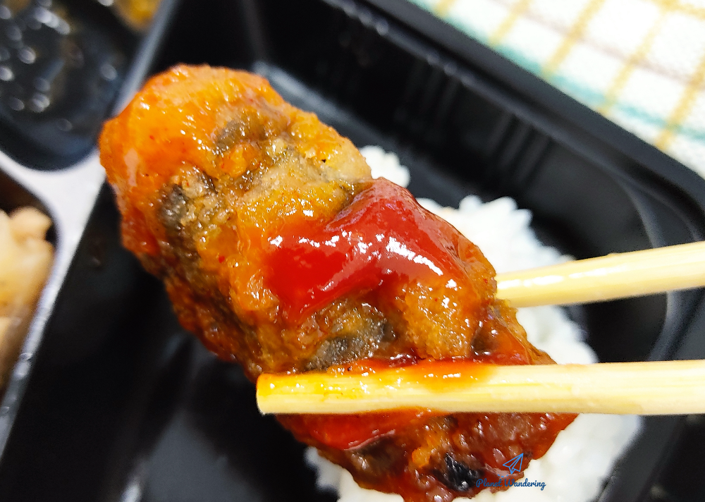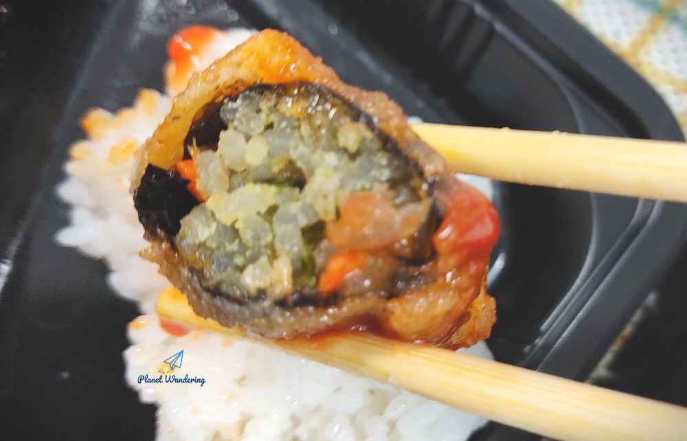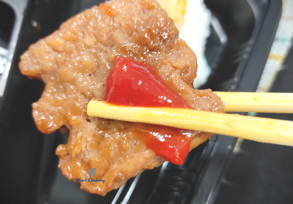 분식집 분위기의 반찬 4종에 토마토 케첩을 폭넓게 살포합니다. 그냥 쓰레기통으로 들어갈 법했던 맥도날드 케첩이 제값을 다하는 순간입니다. 앞으로 도시락 먹을 때 요긴하게 쓰도록 케첩을 잘 모아야겠네요. 케첩이 올라간 만두, 김말이, 너비아니는 토마토의 상큼한 맛이 더해지며 훨씬 맛이 좋아졌습니다. 튀길 때 사용한 기름기도 살짝 씻어내는 느낌이 좋았고 편의점 도시락에서 처음 만나는 김말이도 조금 딱딱했지만 맛있게 먹었습니다.