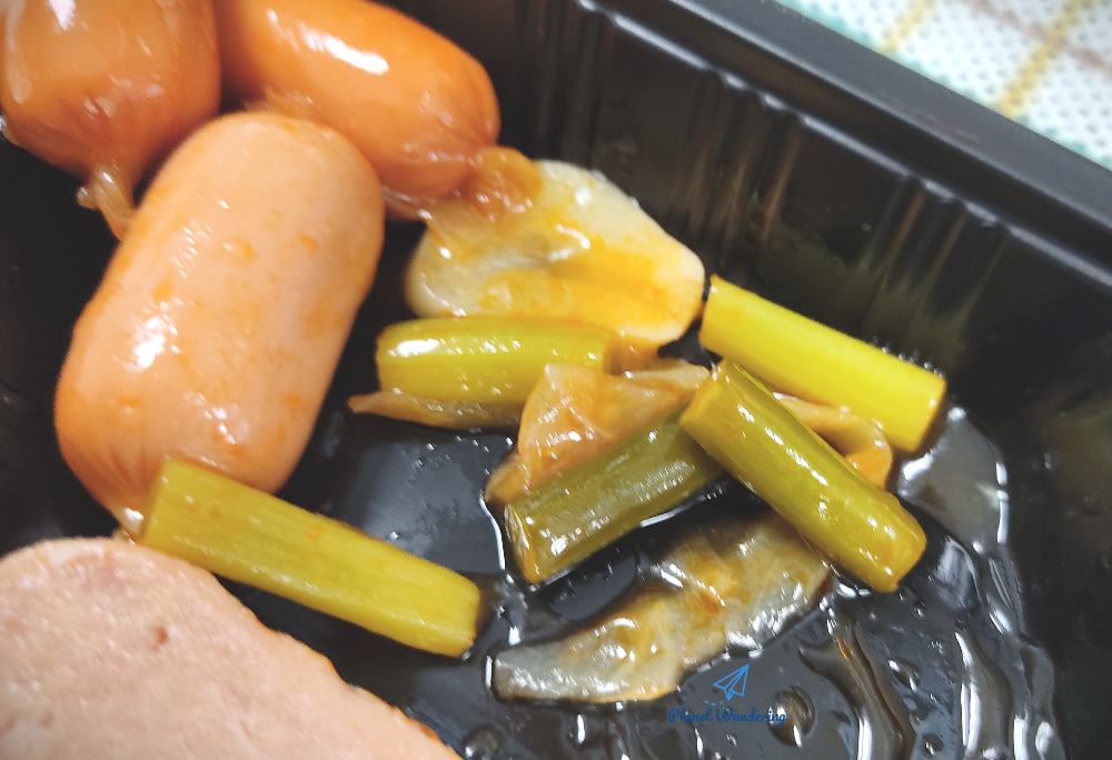 밥은 차분한 느낌으로 너무 딱딱하지도 질지도 않습니다. 밥의 양은 상대적으로 적고 반찬이 많은 도시락이기는 하지만 리챔은 맛이 괜찮아서 한두장 더 들어있었으면 하는 아쉬움도 있습니다. 반찬들을 살펴볼까요? 기름과 마늘, 마늘종을 함께 넣고 볶은 비엔나소시지가 있습니다. 마늘도 한쪽 보이고 마늘종은 많이 담겼네요. 소시지와 양념에서 마늘향이 많이 납니다. 먹고 난 후 입안에 냄새가 남을 정도는 아니지만 드시는 도중에는 마늘향이 좀 있을 겁니다.