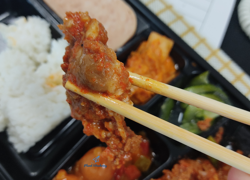 백종원 매콤불고기반상 도시락의 핵심 구성인 매콤불고기입니다. 스페인과 네덜란드에서 건너온 돼지고기를 고추장소스로 볶았는데 붉은빛에 고추까지 올라와 있어 보기에도 매콤한 맛이 느껴집니다. CU도시락의 불고기는 냉장 유통 과정에서 서로 뭉쳐지는 게 조금 아쉽습니다. 전자레인지에 돌리면 따뜻해지면서 뭉침이 조금 풀리겠지만, 전자레인지 안 쓰고 그냥 차갑게 먹는 방랑객은 덩어리로 뭉쳐있는 불고기가 조금 아쉽네요.