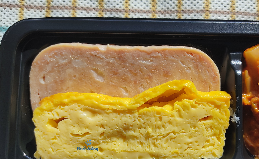밥은 커다란 판에서 잘라 도시락에 올린 듯 네모 반듯한 흔적이 남아있고, 무게로 밥 양을 측정한 듯 작은 한판이 더 얹어져 있습니다. 속에 아무것도 없는 순수 달걀찜 한 조각과 스팸 (백종원의 빽햄) 한 조각이 들어있습니다. 스팸은 따로 조리하지 않고 그냥 잘라 넣은 생 스팸 느낌이죠.