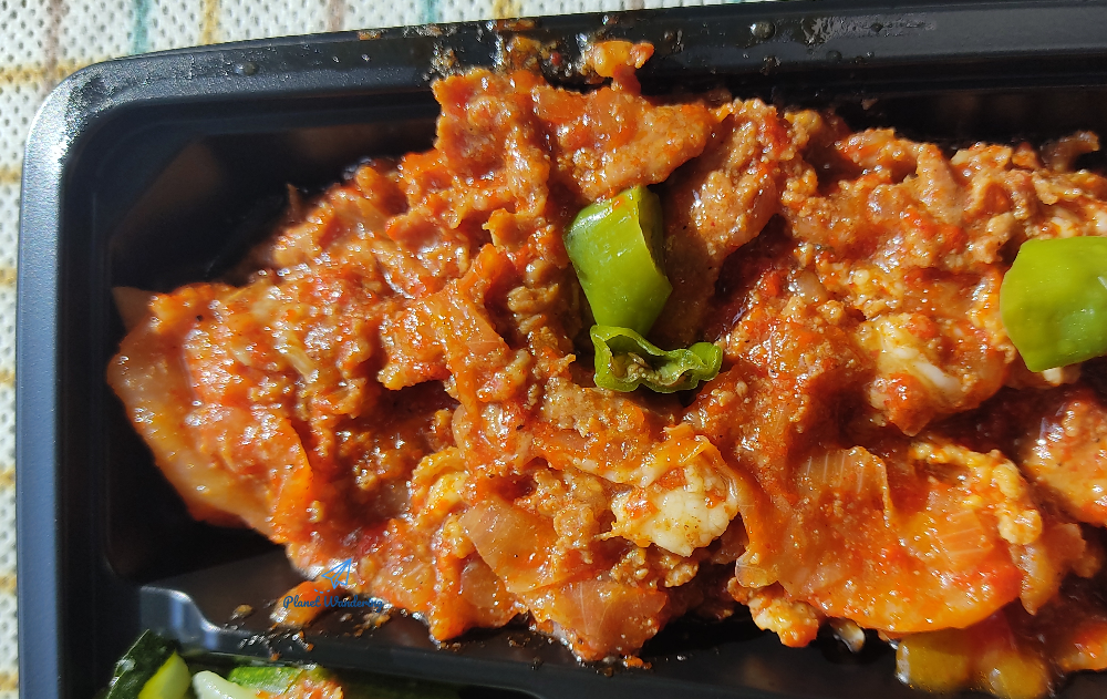 매콤불고기의 맛은 매운맛과 달콤한 맛의 중간에서 매운맛에 성큼 가깝습니다. 고기는 먹기 적당한 두께에 부드러운 식감이 좋은데 매운 양념은 강한 편이죠. 소화기관이 약한 분들은 매콤불고기 다 드신 후 속이 살짝 쓰린 경험을 하실 수도 있습니다. 약간 날카롭게 매운맛이라 하겠네요.
