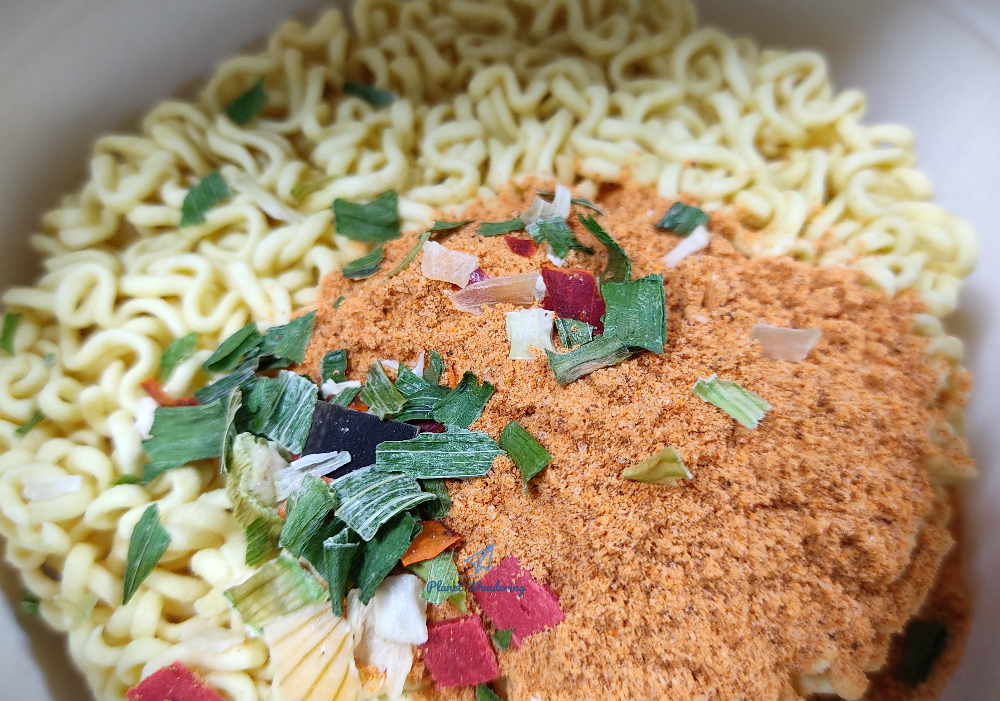 건더기 스프도 만만치 않습니다. 동결 건조한 파와 빨간 고추 조각이 듬뿍 들어있네요. 파는 그렇게 맵지 않지만 고추는 작게 썰어도 매운맛이 살아있어서 고추를 씹게되면 입 안에서 매운 맛이 폭발하기도 하죠. 매운맛을 즐기지 않는 분들이라면 건더기 스프를 반만 넣어도 괜찮을 것 같네요.