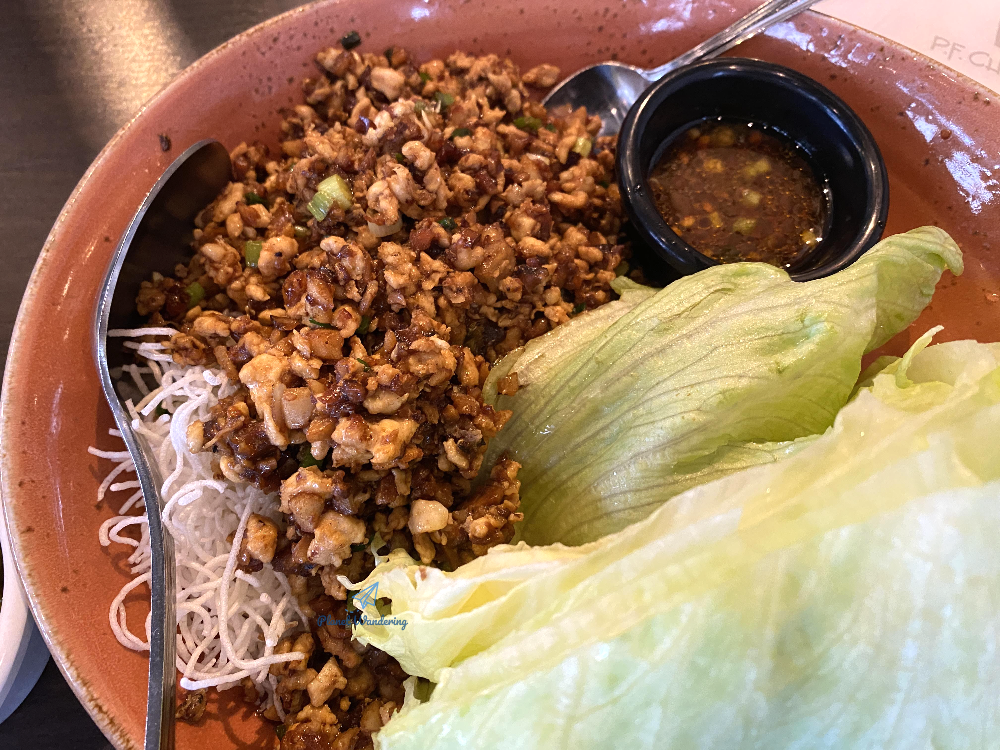 가장 먼저 나오는 창스 치킨 래터스 랩입니다. 다진 닭고기와 버섯 등을 소스와 함께 볶고 바삭하게 튀긴 라이스 스틱과 함께 양상추에 싸 먹는 일종의 쌈 요리입니다. 처음 보면 어떻게 먹는 거지, 약간 당황감이 밀려오기도 하죠. 피에프창에서 말하는 창스 치킨 래터스 랩 먹는 방법은 먼저 양배추를 한 장 뜯어 손에 올리고 닭고기 볶음 한 스푼과 라이스 스탁 약간을 양배추 위에 올란 다음, 소스를 살살 뿌려 한 입에 양배추 쌈으로 먹는 겁니다.