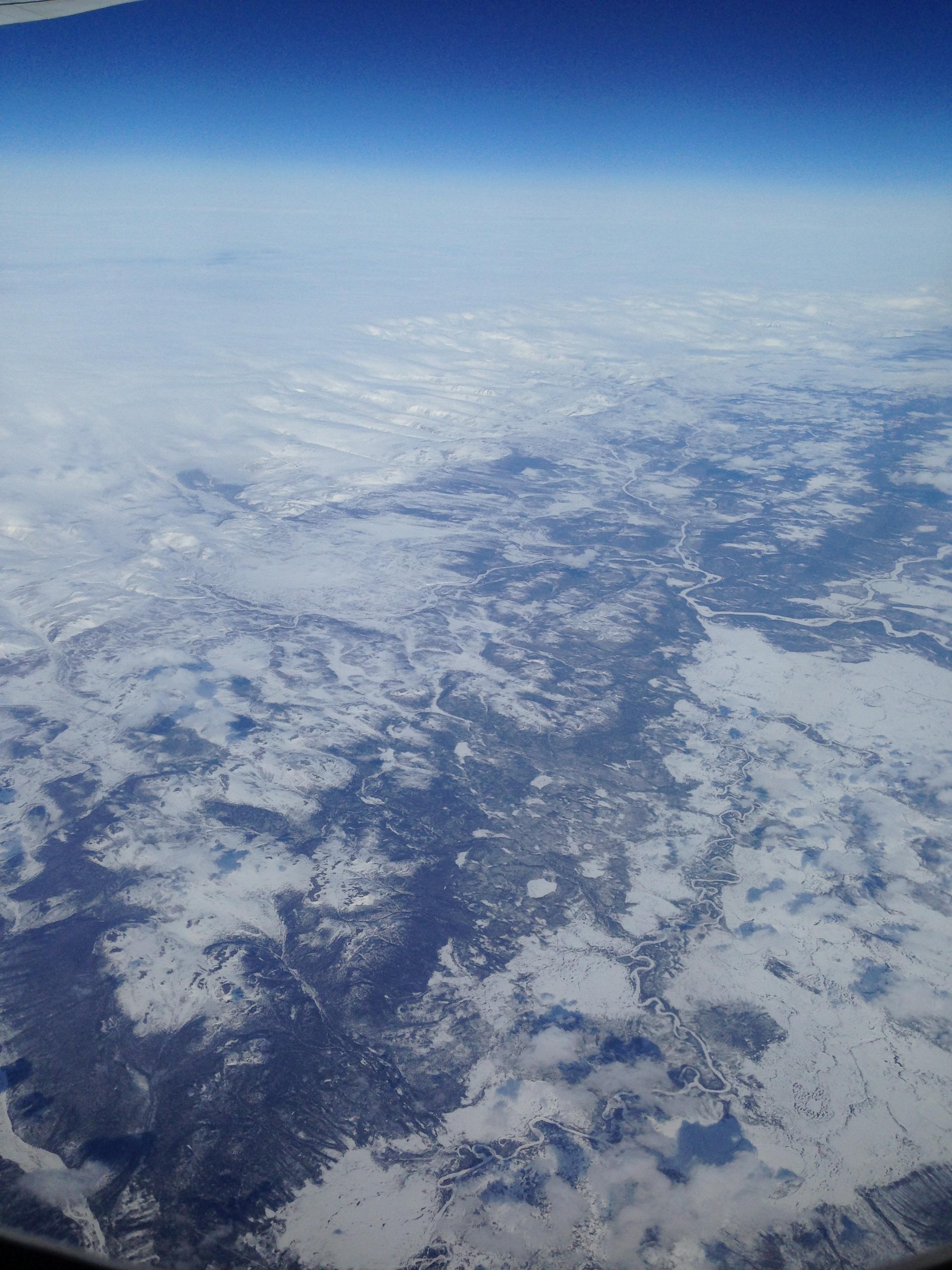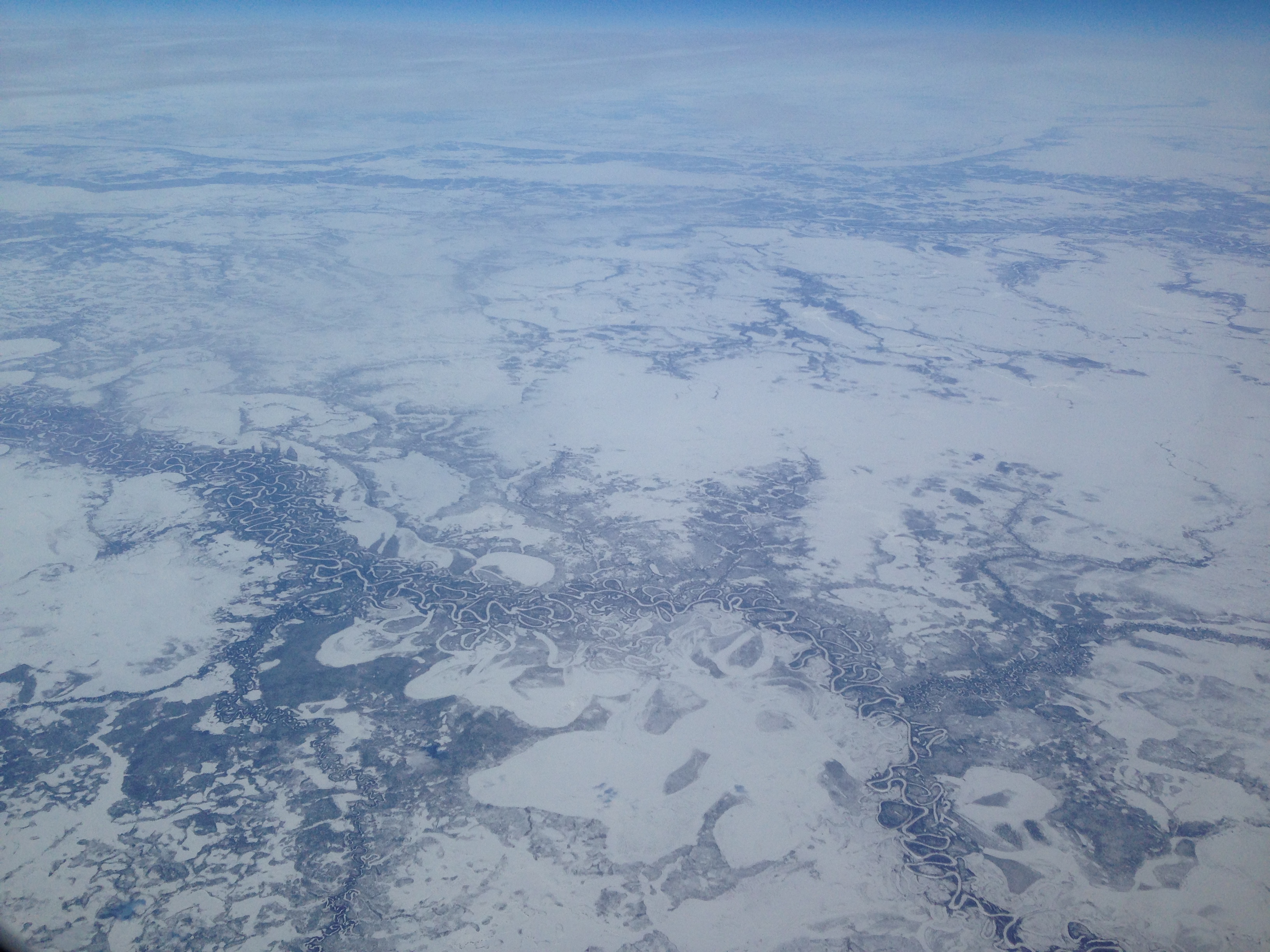 드디어 꽁꽁 얼은 동토의 대지가 나타납니다. 구름 사이로 살펴보면 물줄기가 하얗게 얼어붙은 걸 볼 수 있습니다.