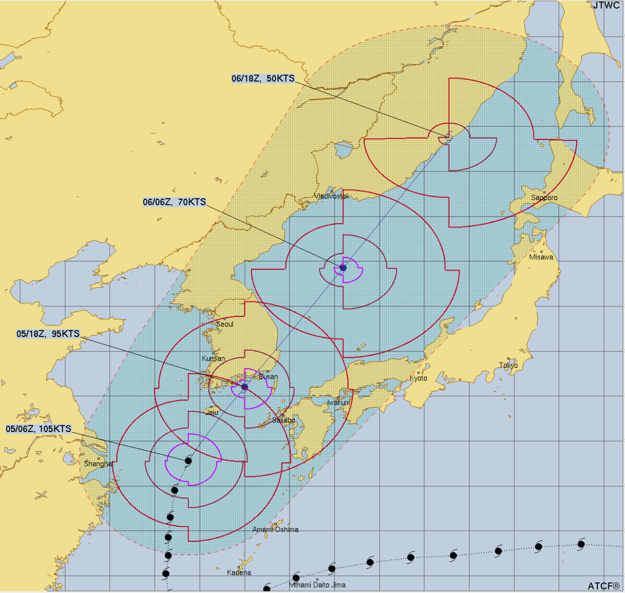 미국합동태풍경보센터 JTWC - 6일 오전 6시 부산-김해 상륙, 오전 9시 포항 동해로 진출