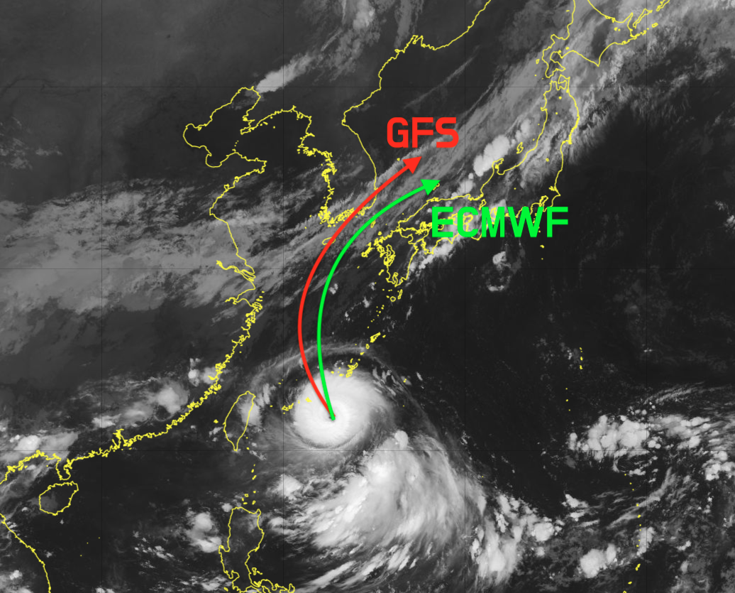 일본기상청도 JTWC와 유사한 태풍 진로를 예상하는 가운데, 북진하던 태풍 힌남노가 9월 5일이 되면 방향을 살짝 틀어 우리나라 남해안을 겨냥할 것으로 전망하고 있습니다. 우리나라 남해안 목전까지 진출하는 9월 6일에도 태풍 힌남노는 중심기압 945헥토파스칼, 최대풍속 초속 45미터의 매우 강한 태풍이 될 것으로 보입니다.