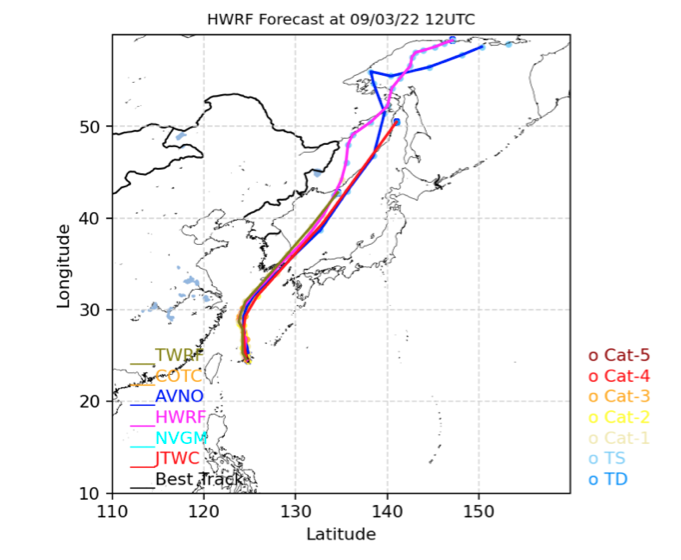 미국합동태풍경보센터 JTWC도 일본기상청과 유사한 태풍진로를 예상하고 있으며 태풍의 진행속도를 일본기상청보다 약간 빠르게 전망하고 있습니다. 9월 6일 새벽 3시의 예측을 보면, JTWC는 태풍의 중심이 제주도를 막 통과할 것으로 보는 반면, 일본기상청은 태풍의 중심이 제주도를 통과하기 전으로 보고 있습니다.