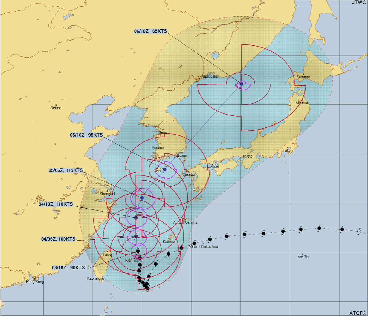 JTWC 기준 9월 6일 각 지역 별 태풍 중심의 예상통과 시점