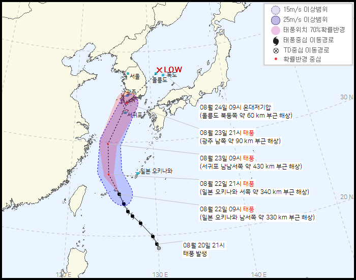 우리나라 기상청의 태풍 예상진로는 JTWC와 유사한 경로로, 8월 23일 낮 시간대에 제주도 서쪽 해안을 지나 같은 날 밤 9시 경, 전남 목포 인근 연안에 상륙할 것으로 전망하고 있습니다.