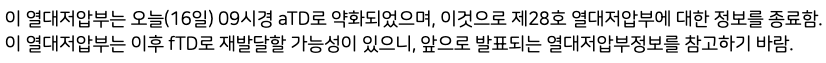 우리나라 기상청도 일본기상청과 동일한 내용을 안내하고 있으며, 이후 이 열대저압부가 다시 되살아날 수 있다는 단서를 달아놓았습니다.
