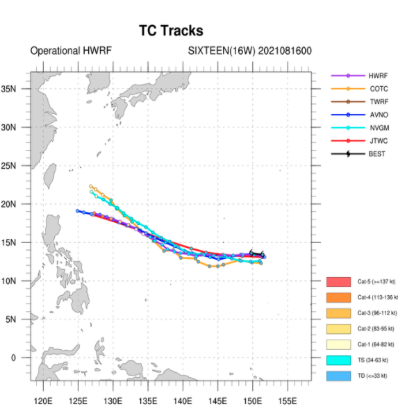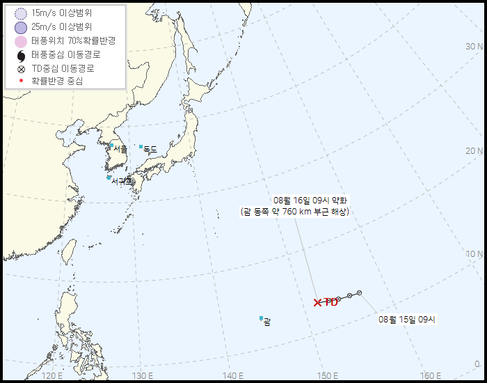 8월 15일 (어제) 밤까지만 해도 열대저압부 TD16W는 미국령 괌을 관통한 후 머리를 북서쪽으로 들어 타이완 남부를 향할 것으로 예상되었습니다.