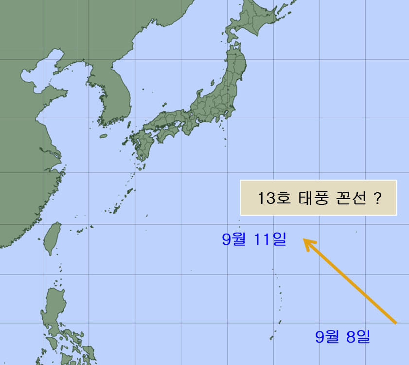 8월 26일 예측에 따르면 '9월 8일 경, 태평양 먼바다에서 13호 태풍 꼰선이 발생하여 9월 11일까지 북서쪽 방향으로 북상할 것'으로 전망됩니다.