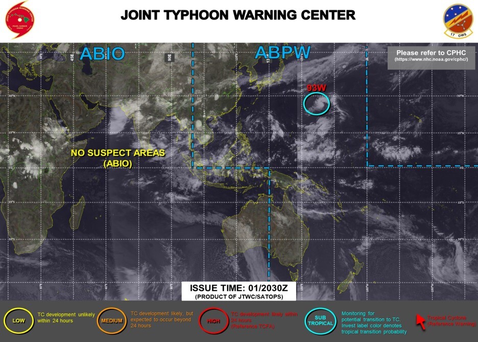 이 열대요란 93W는 일본 남동부 태평양 먼바다에 위치해 있으며 오늘 오전 7시에 촬영한 일본 히마와리 위성의 위성사진에서도 확인할 수 있습니다.
