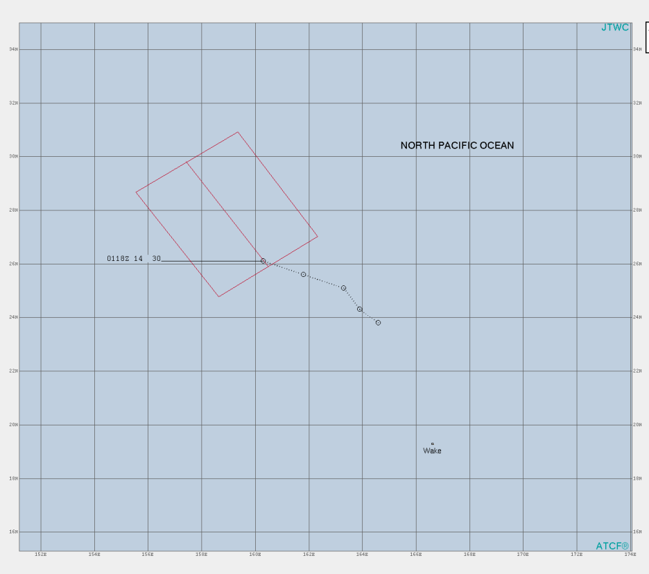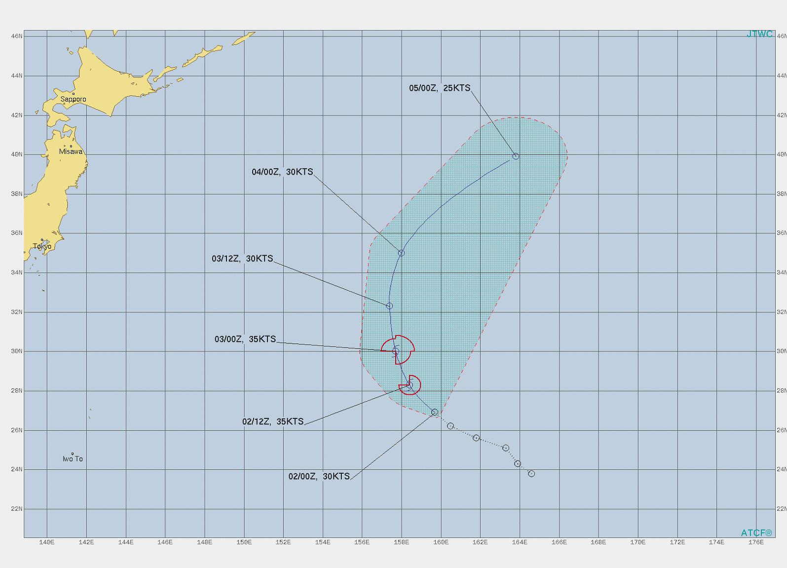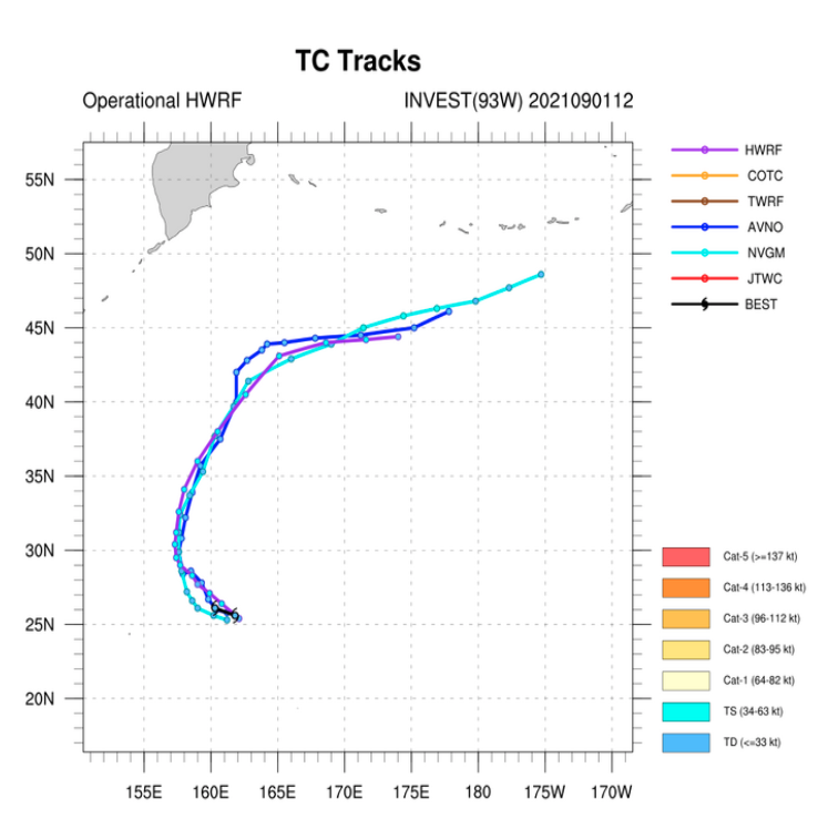 미국해양대기청의 HWRF 사이트에서는 이 열대요란이 북동쪽으로 큰 원을 그리며 진출할 것으로 예상하고 있으며 러시아 캄차카 반도 남부 해역을 지날 것으로 예상하고 있습니다.
