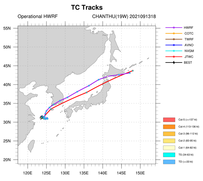 한편 미국해양대기청의 HWRF 예측모델은 태풍 찬투가 목포 인근에 상륙하여 전라남도 내륙, 경상남도 내륙을 관통한 후 경북 포항 인근에서 동해로 진출할 것이라는 약간 다른 진로를 예측하고 있기도 합니다.
