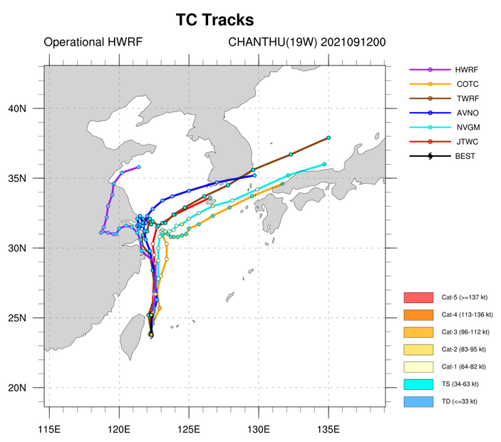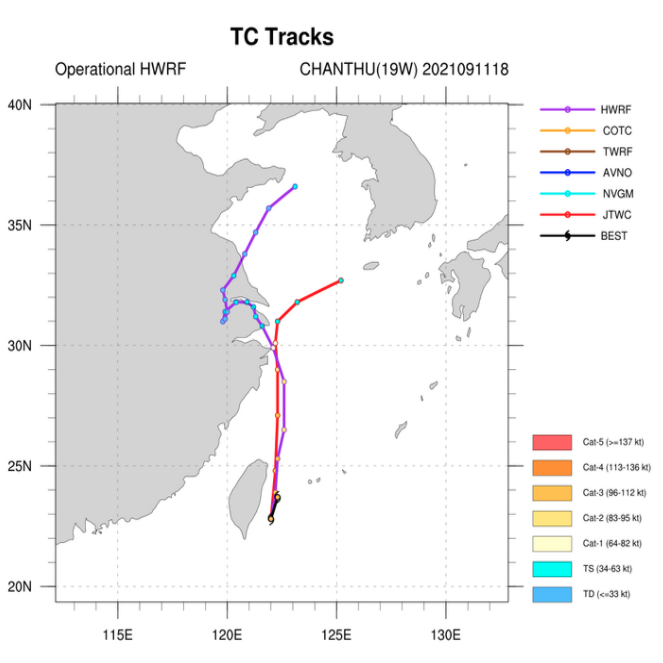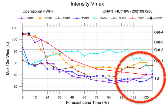 한편, 미국해양대기청 NOAA가 운영하는 HWRF 예측모델은 태풍 찬투가 중국 내륙으로 더 진입하여 북상한 후 중국 산둥반도 인근으로 진출하여 우리나라 중부지방 서해로 향할 것으로 예상하고 있습니다. 서해 진출 시점의 태풍 강도는 일본 기상청이 예상하는 태풍 찬투의 강도와 유사할 것으로 보입니다.
