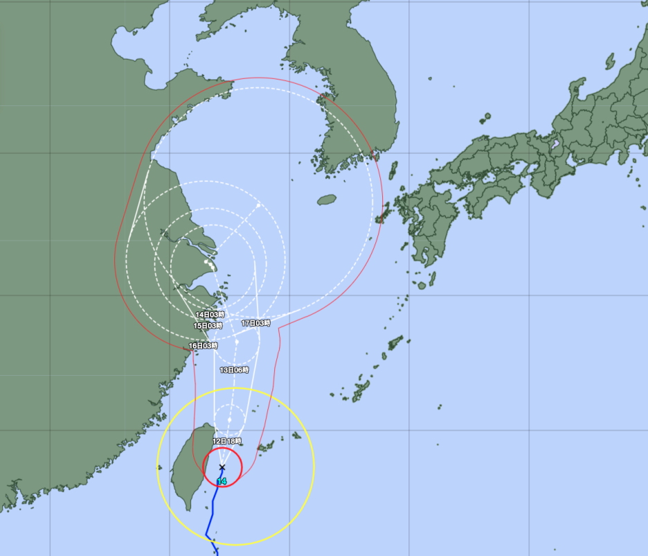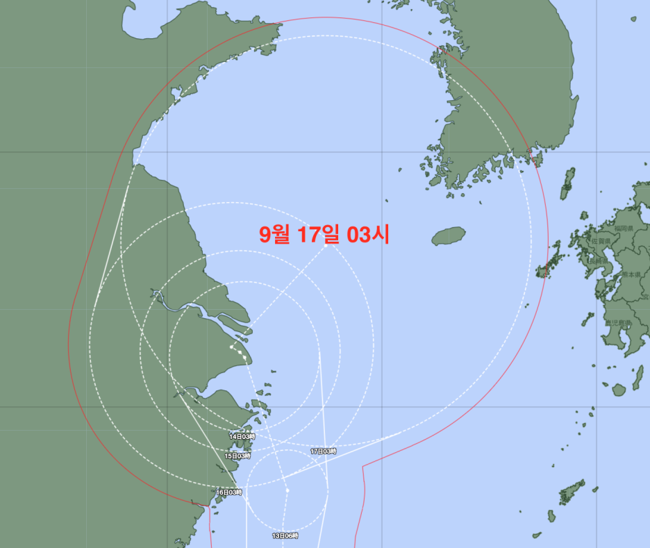 일본기상청은 JTWC의 예측 대비 태풍의 진행 속도가 다소 느릴 것으로 예상하고 있어, 9월 17일 오후 3시 태풍 찬투는 전남 여수 인근을 지날 것으로 전망하고 있습니다. JTWC는 같은 시각이면 태풍이 부산에 도착할 것으로 예상하고 있습니다.