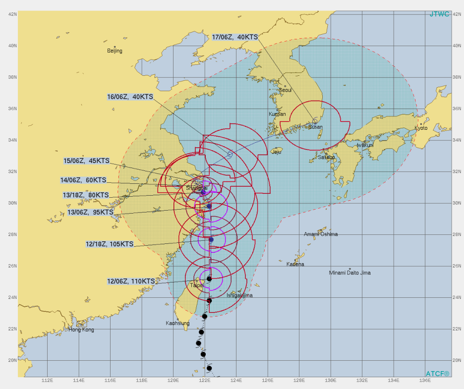 일본기상청 JMA - 14호 태풍 찬투 중국 상하이 인근을 통과해 전남 서해안을 향할 듯