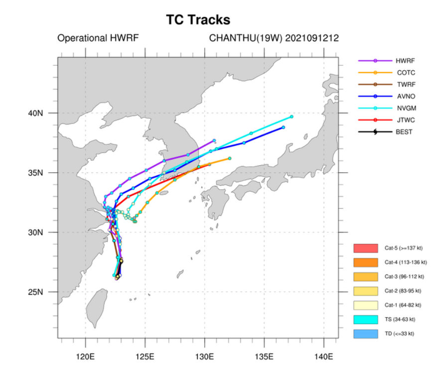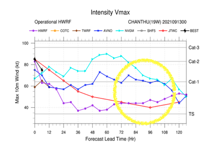 한편 HWRF사이트가 제공하는 여러 태풍예측모델들의 14호 태풍 찬투의 이동경로 예측에 따르면, 일부 예측모델들은 14호 태풍 찬투가 좀 더 북쪽으로 이동하여 우리나라 남부 내륙, 또는 중북 내륙을 관통할 것이라는 예측을 내놓고 있습니다.