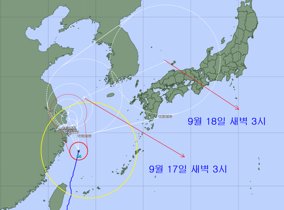 14호 태풍 찬투의 9월 17일 남해안 통과 가능성이 높습니다.