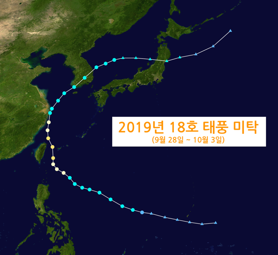 가까운 과거에 유사한 시기, 유사한 경로의 태풍으로는 2019년 9월 28일부터 10월 3일까지 활동한 2019년 18호 태풍 미탁을 들 수 있습니다. [대형의 강한 태풍]으로 기록된 태풍 미탁은 우리나라 남부지방을 지나며 기록적인 폭우를 쏟아부었고 사망 실종 등 인명피해와 산사태 등 재산피해가 컸습니다.