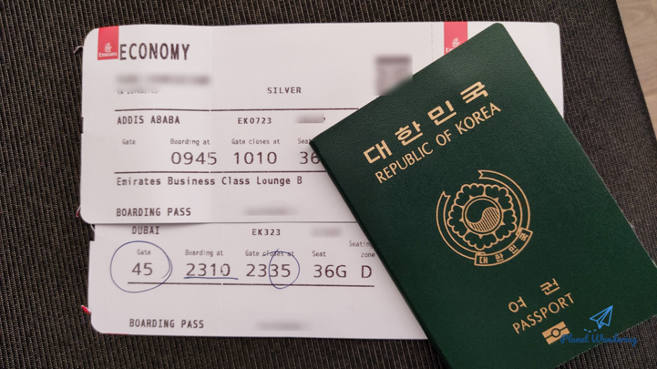 줄을 서지 않고 금방 짐을 부치고 탑승권을 받았습니다. 두바이까지 1장, 두바이에서 아디스 아바바까지 1장입니다. 작년 11월에 똑같은 여정을 움직일 때는 두바이 방역당국에 제출하는 복잡한 신고서도 작성을 했는데 이제는 절차가 간소화되었고, 탑승 수속을 할 때는 음성확인서와 e비자만 보여주면 됩니다.