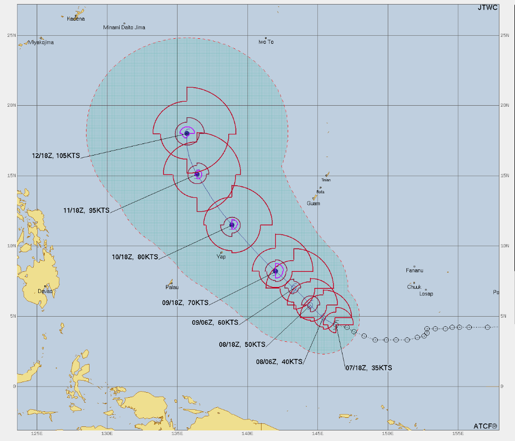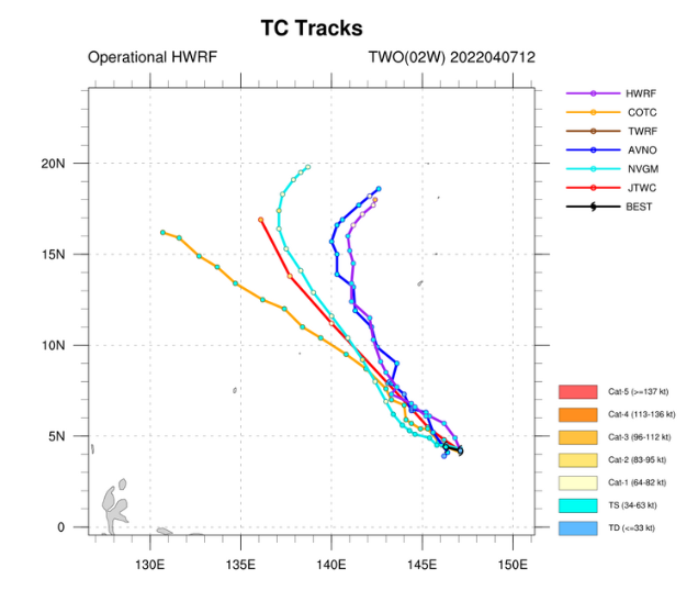 미국합동태풍경보센터는 열대저기압(태풍 말라카스 예정)이 동경 146도 부근을 지나며 북쪽으로 방향을 틀어 북서진하고 있으며 대략 4월 13일까지 필리핀해를 지나며 방향을 정북향으로 바꿔갈 것으로 예상하고 있습니다.