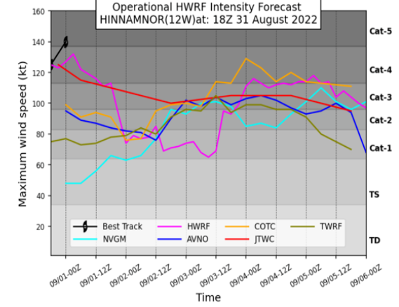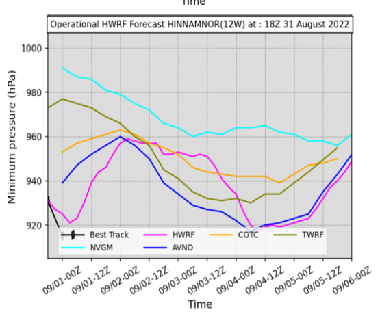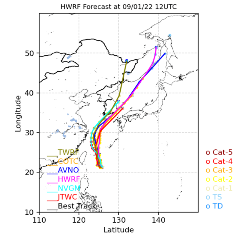 미국해양대기청 NOAA가 제공하는 HWRF 사이트를 살펴보면 여러 태풍예측모델들이 조금씩 다른 태풍 예상진로를 내놓고 있음을 알 수 있습니다. 태풍 힌남노의 중심이 대한해협을 지난다는 예측이 있는가 하면, 전남 남해안을 지난다는 예측도 있습니다. 가장 대중적인 미국합동태풍경보센터 JTWC, 일본기상청, 우리나라 기상청의 예보가 가장 정확도가 높지만 그 밖의 예측모델들이 제시하는 예상진로에도 관심을 가져볼 만합니다.