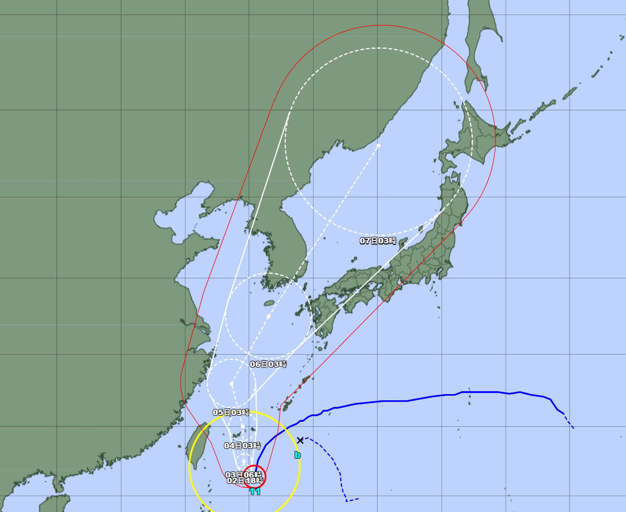 일본기상청도 JTWC와 약간 다르게, 좀 더 우리나라에 피해가 큰 태풍 진로를 예상하고 있습니다. 9월 5일 오전 방향을 북동쪽으로 틀어, 제주도를 향하며 6월 새벽 3시 전후 제주도 동쪽 해안을 지나 경남 통영으로 상륙한 후 포항 앞바다로 빠져나갈 것으로 전망하고 있습니다. 제주도 통과 시점인 6일 새벽 3시의 중심기압은 950헥토파스칼, 최대풍속은 초속 45미터로 상당히 강한 태풍이 지나갈 것으로 예상되며, 태풍의 육상 이동 경로에 속하는 통영, 부산, 대구, 포항 등 지역에 큰 피해가 우려됩니다.