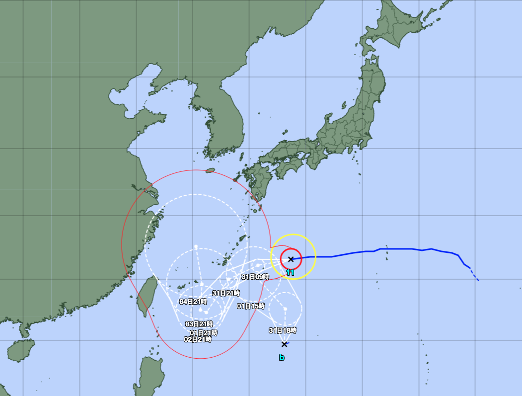아시아 태평양 지역의 태풍 명명권을 가진 일본기상청은 8월 31일에 태풍 무이파 (아래 지도에 열대저기압 b)가 발생할 것으로 전망하고 있습니다. 막 태풍이 되는 시점의 태풍 무이파는 태풍의 기준이 되는 최대풍속 초속 17미터를 간신히 넘긴 후, 9월 1일에는 독립된 태풍으로서의 생애를 마감할 것으로 보입니다.