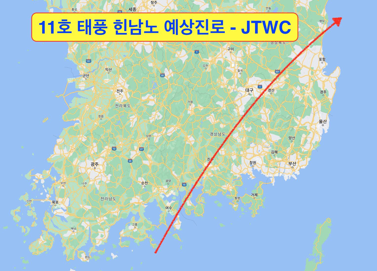 JTWC 예측 - 여수 광양 남해 하동 인근 해역 상륙 후 포항 앞바다로 진출할 듯