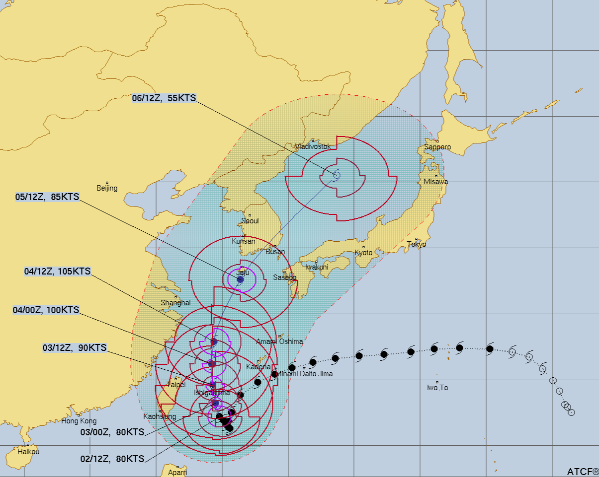 또한 우리나라 경남 남해안에 상륙한 후 경상남북도를 관통하여 동해로 빠져나간 9월 6일 밤에도 최대풍속 초속 28미터의 강풍과 함께 태풍 다운 태풍의 위력을 유지할 것으로 보입니다. 그만큼 우리나라 내륙을 통과하는 시점의 태풍이 매우 강력할 수 있음을 의미합니다.